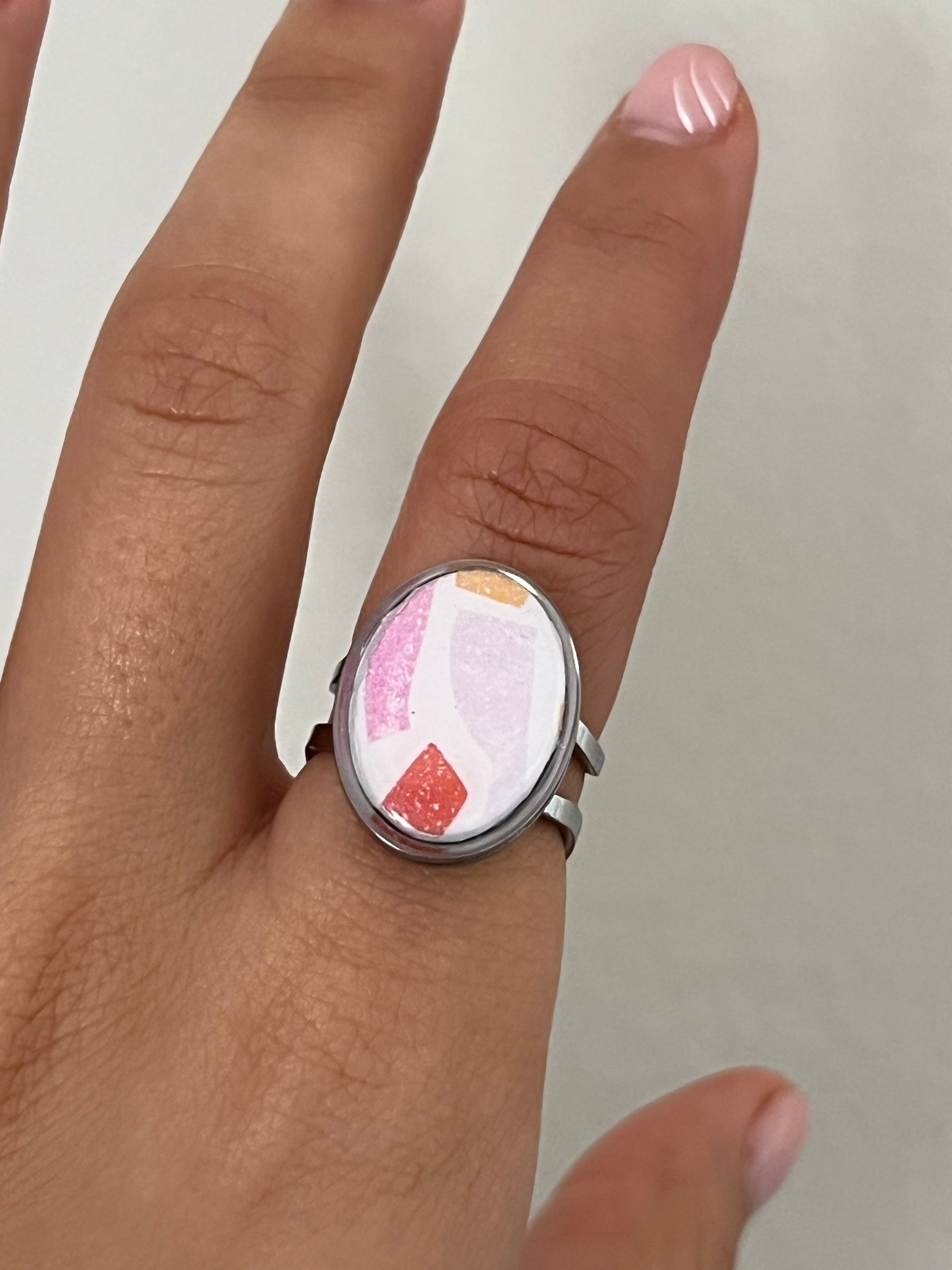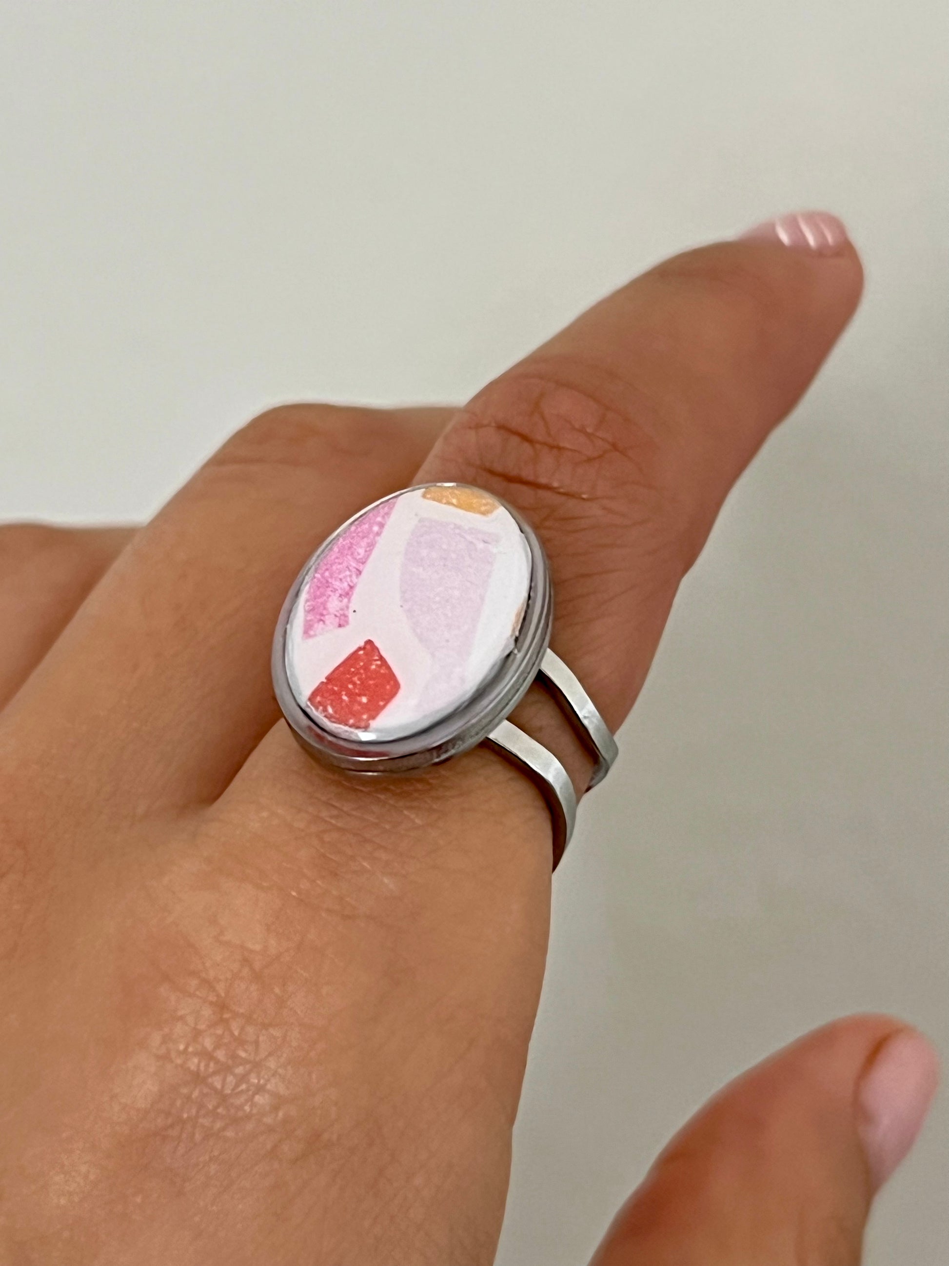 Anillo ajustable hecho a mano con arcilla polimérica, resina UV y acero inoxidable.