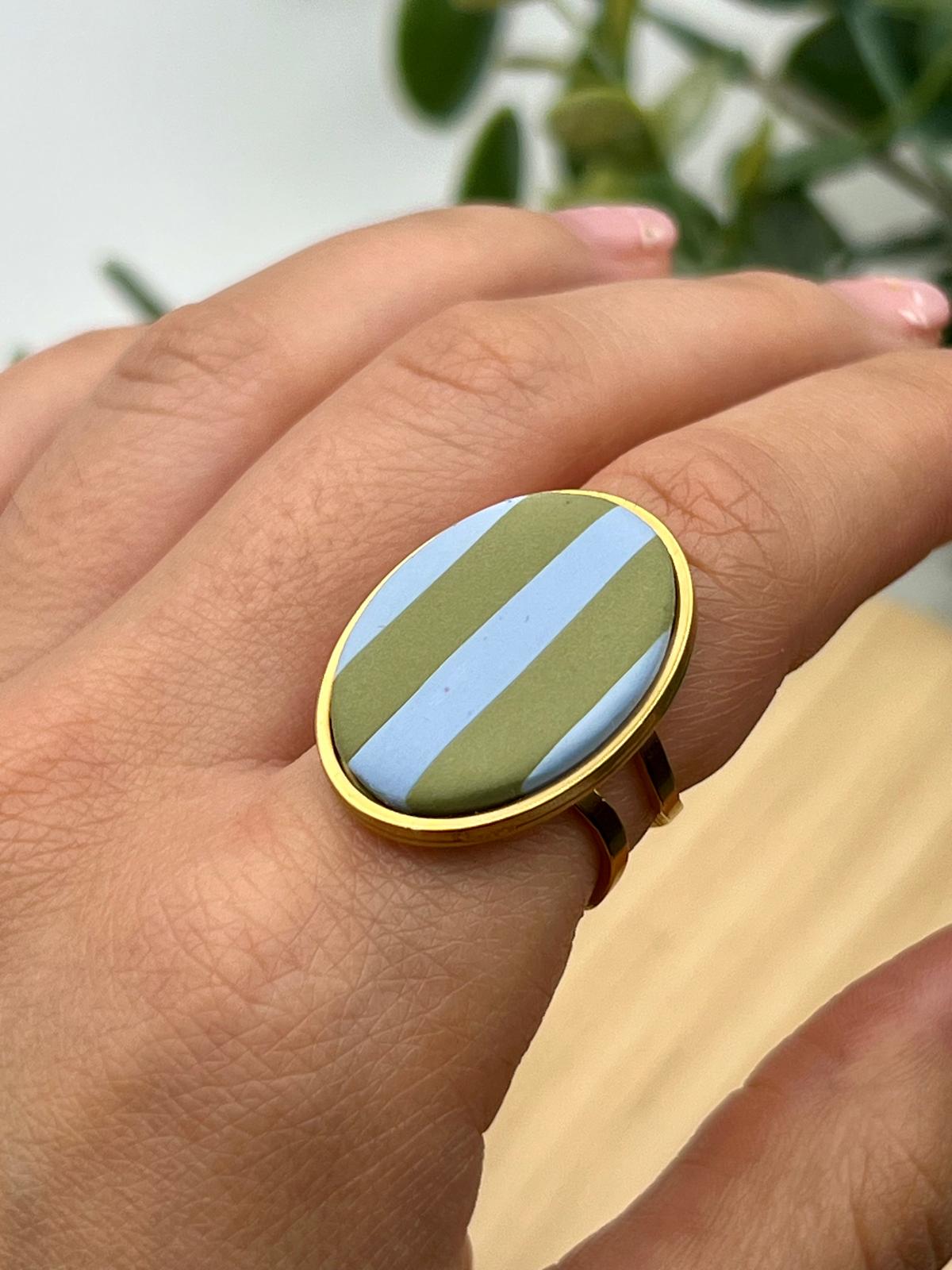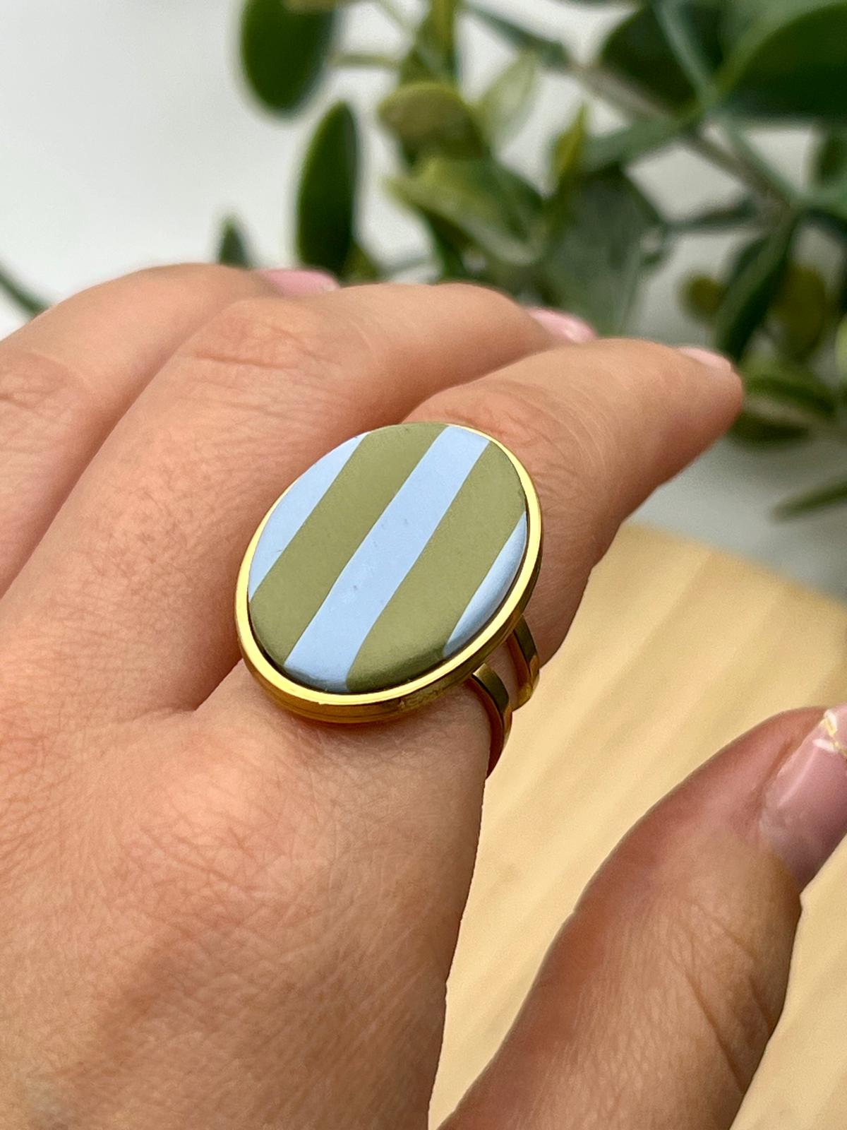 Anillo ajustable hecho a mano con arcilla polimérica y acero inoxidable.