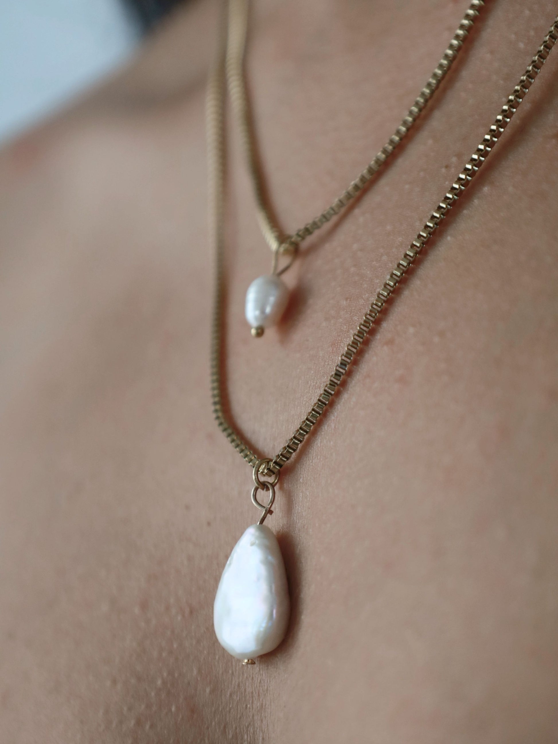 Collar doble de acero con dos perlas, fabricado en acero inoxidable hipoalergénico, resistente y duradero.