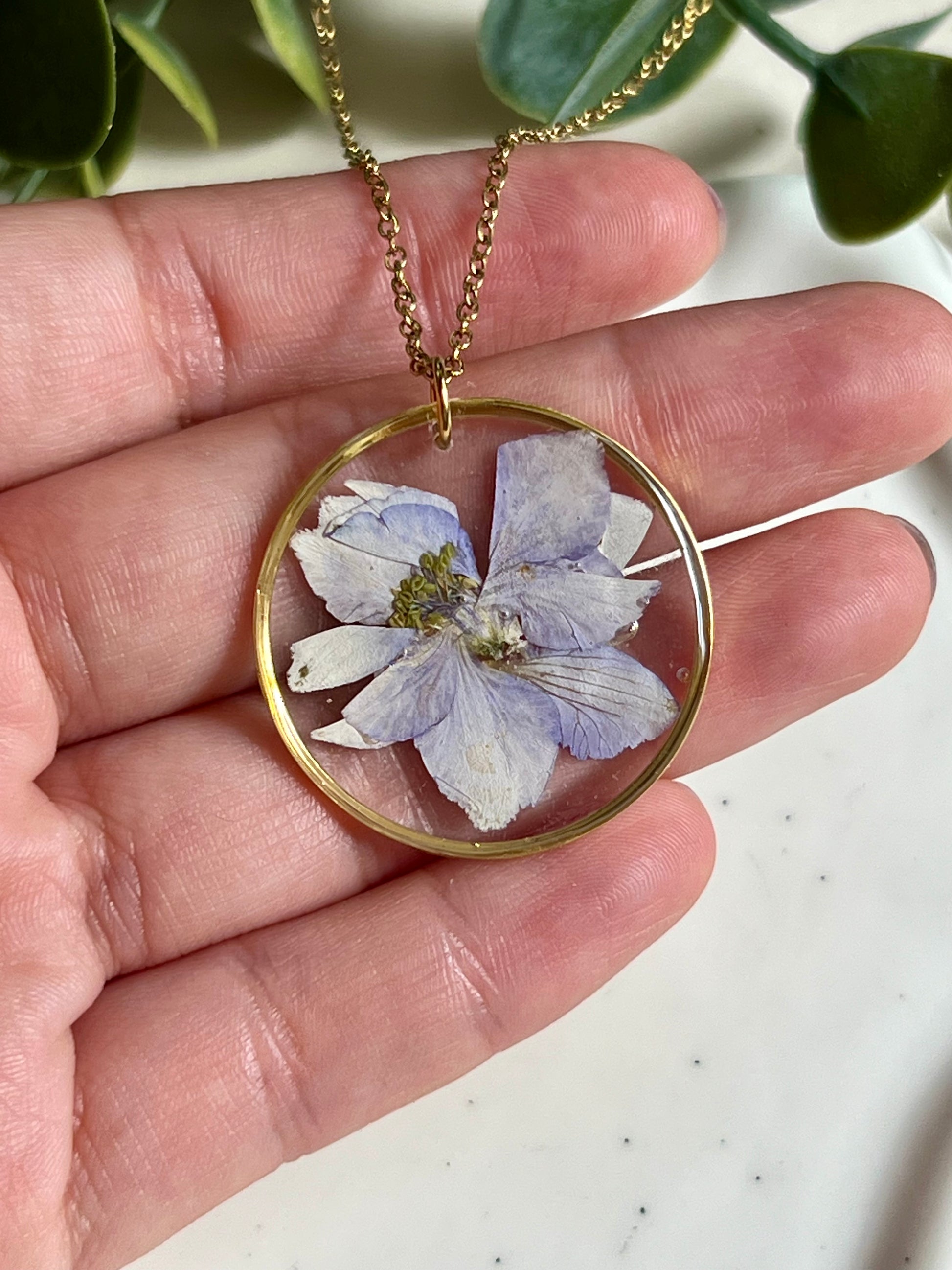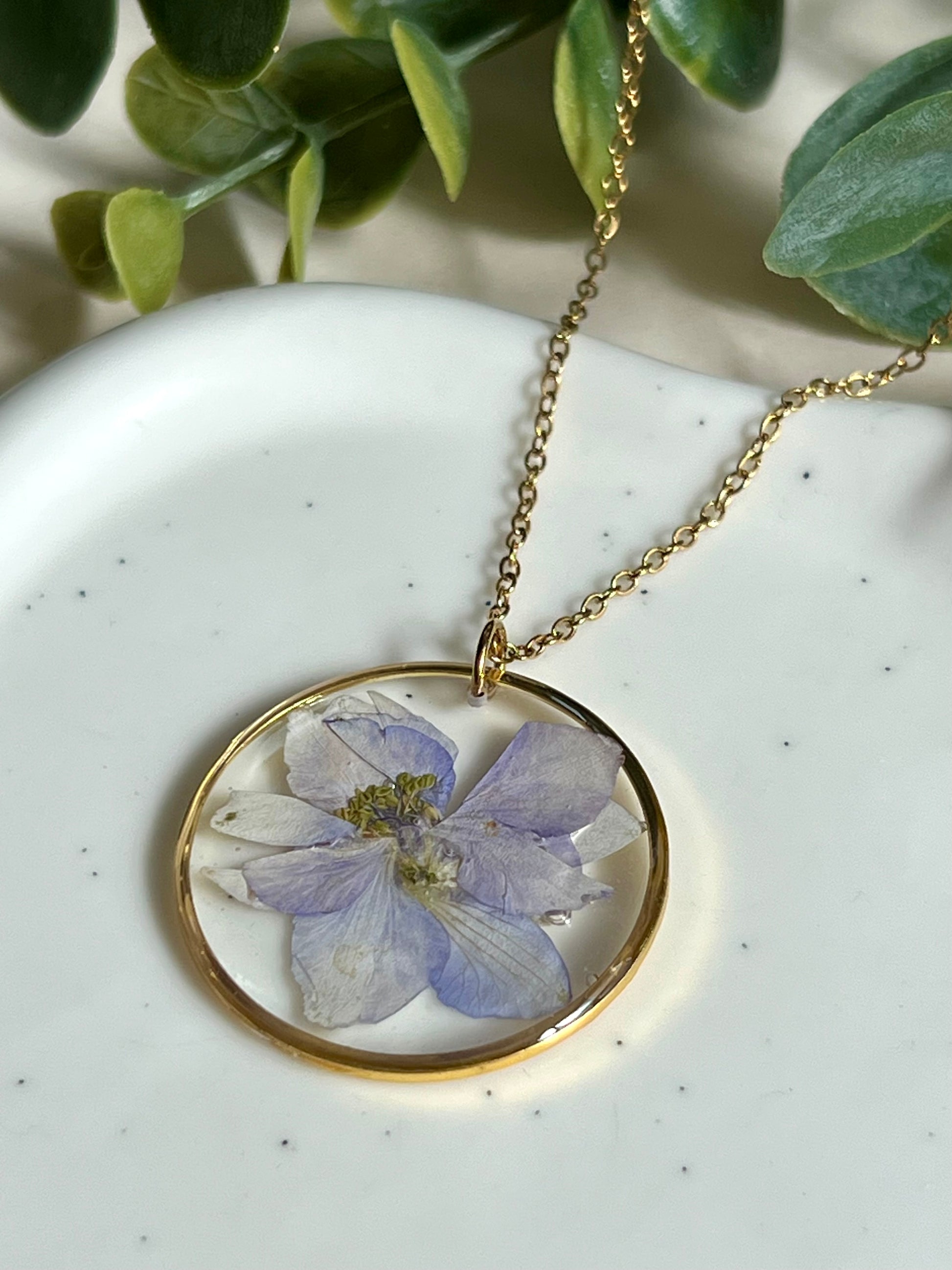 Collar de acero inoxidable hechos a mano con resina UV, flores naturales y acero inoxidable hipoalergénico.