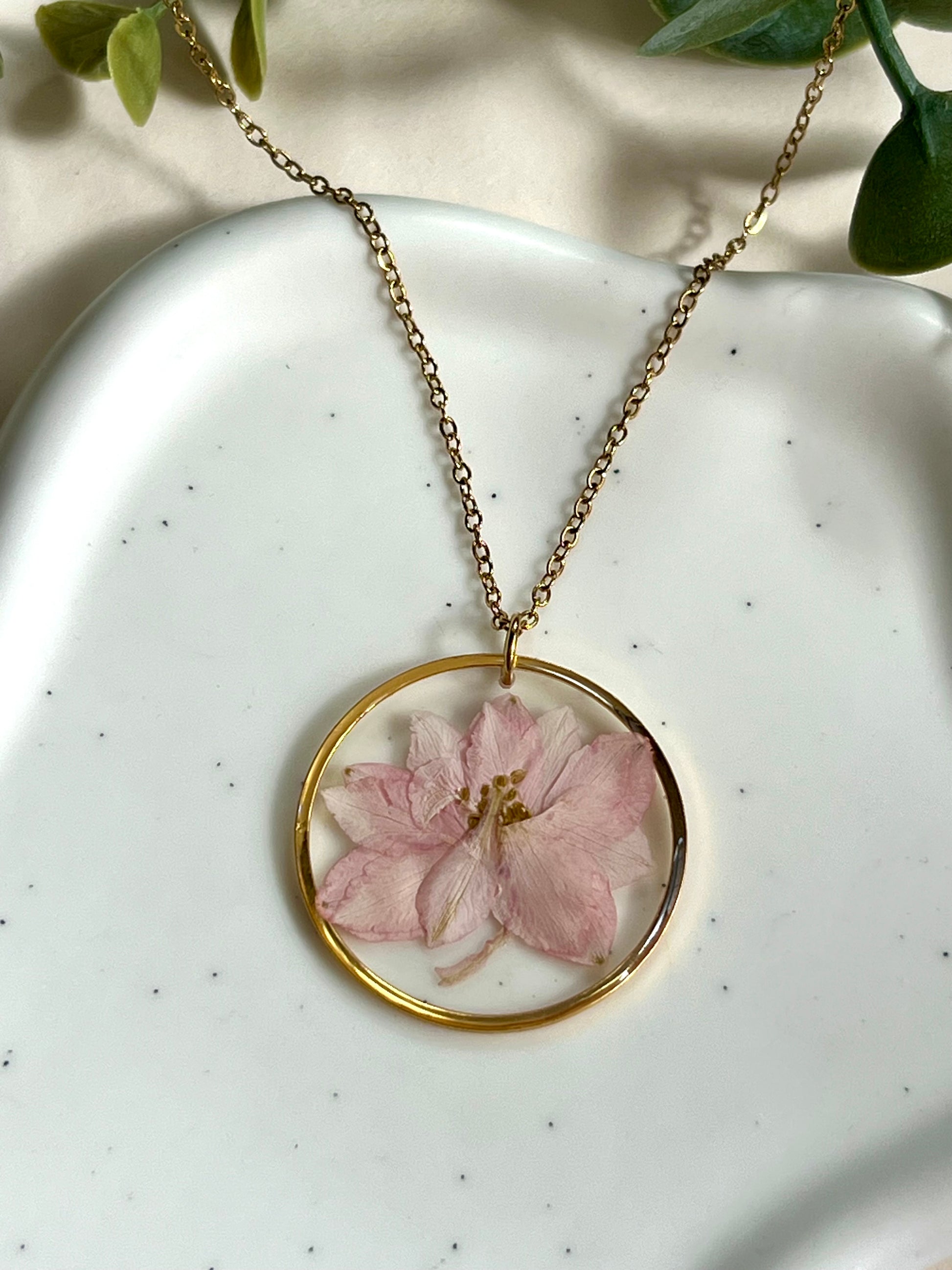 Collar de acero inoxidable hechos a mano con resina UV, flores naturales y acero inoxidable hipoalergénico.