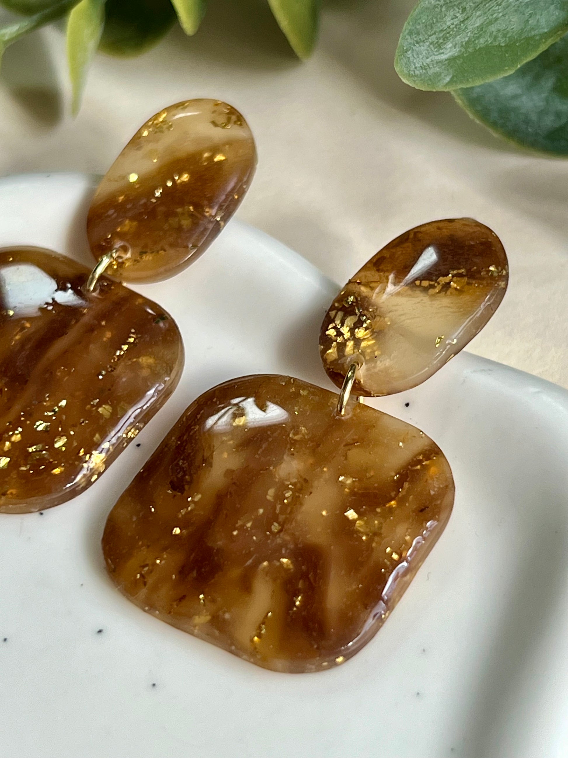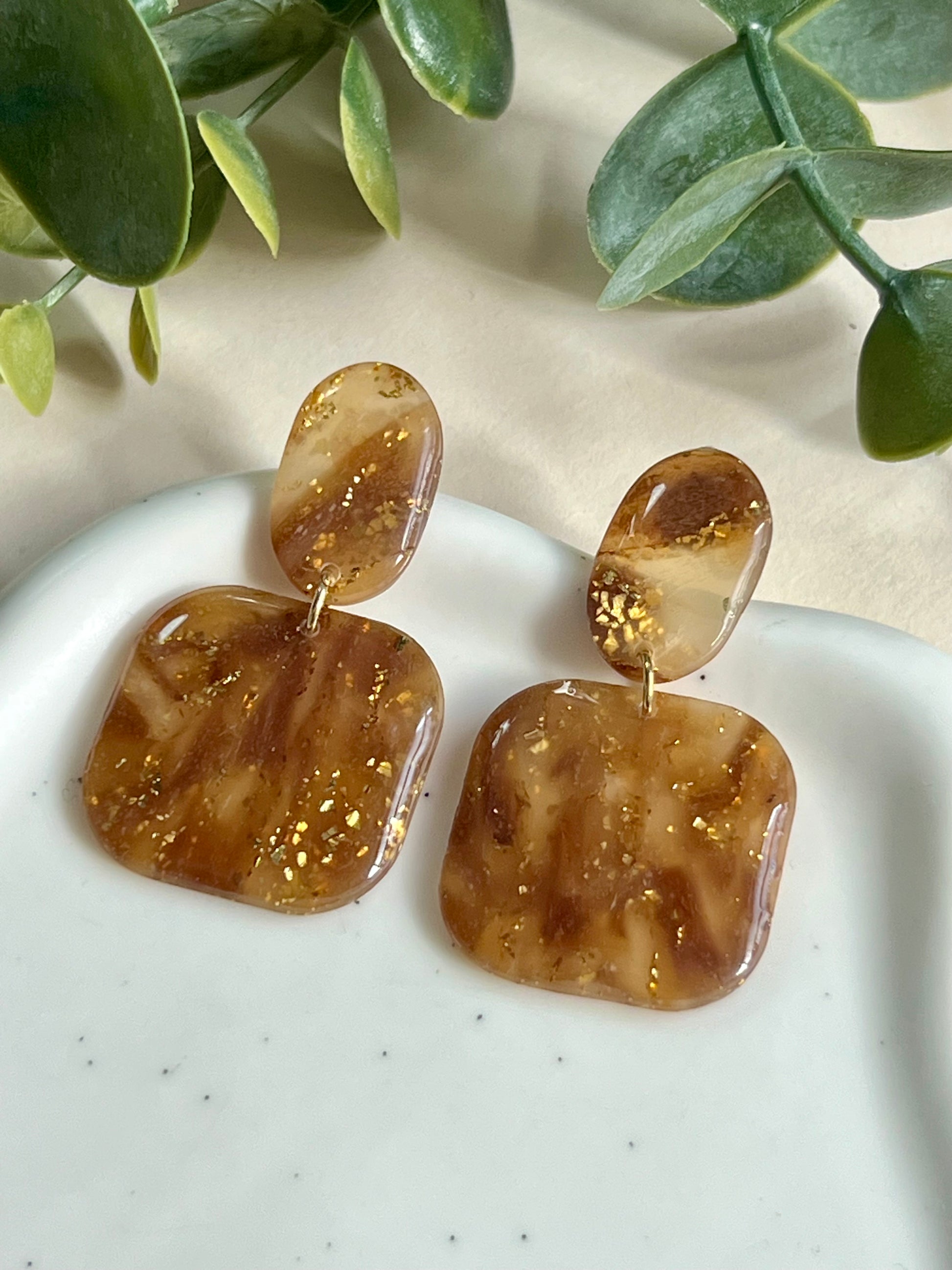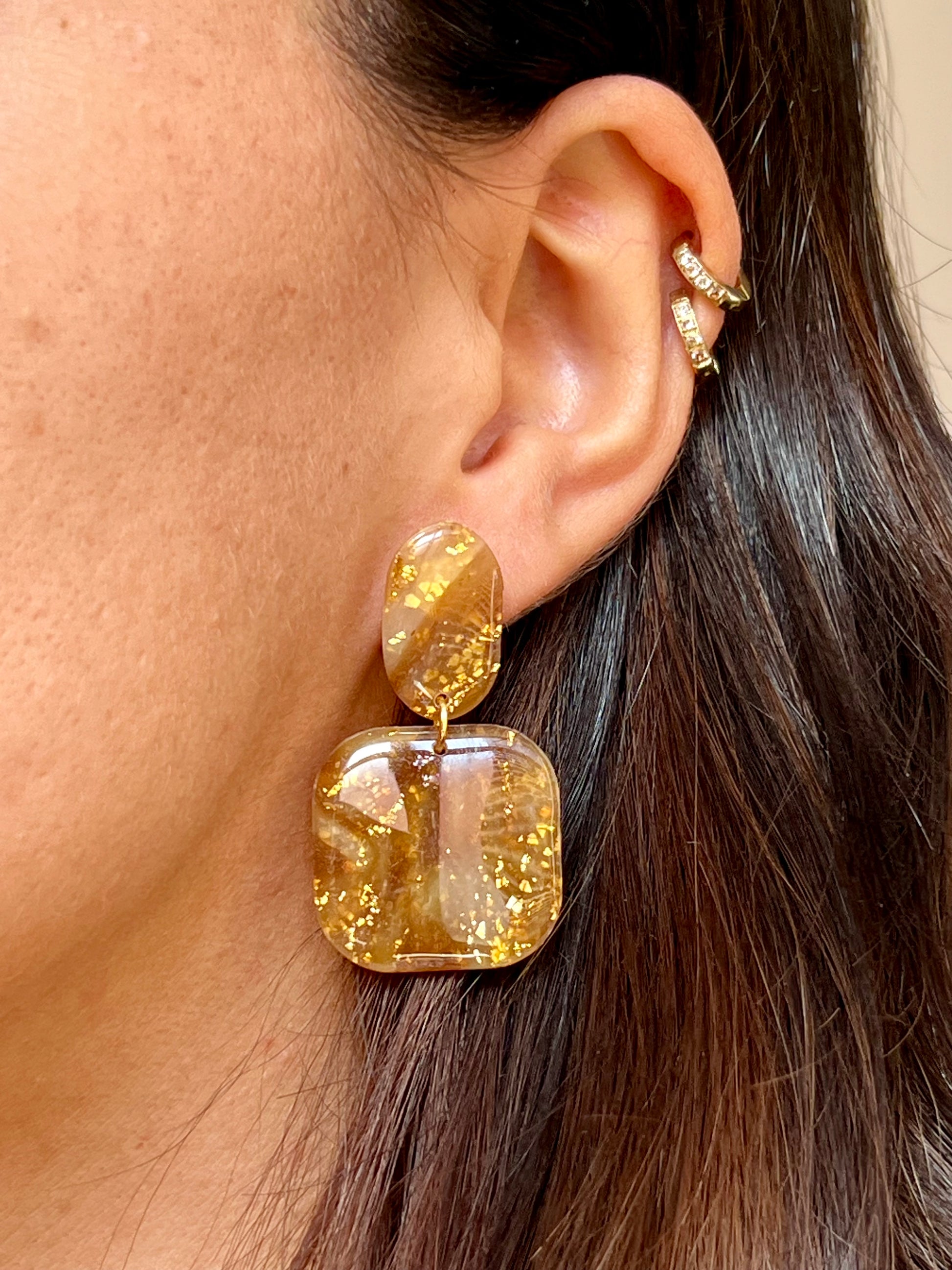 Pendientes hechos a mano de arcilla polimérica, resina UV y acero inoxidable hipoalergénico.