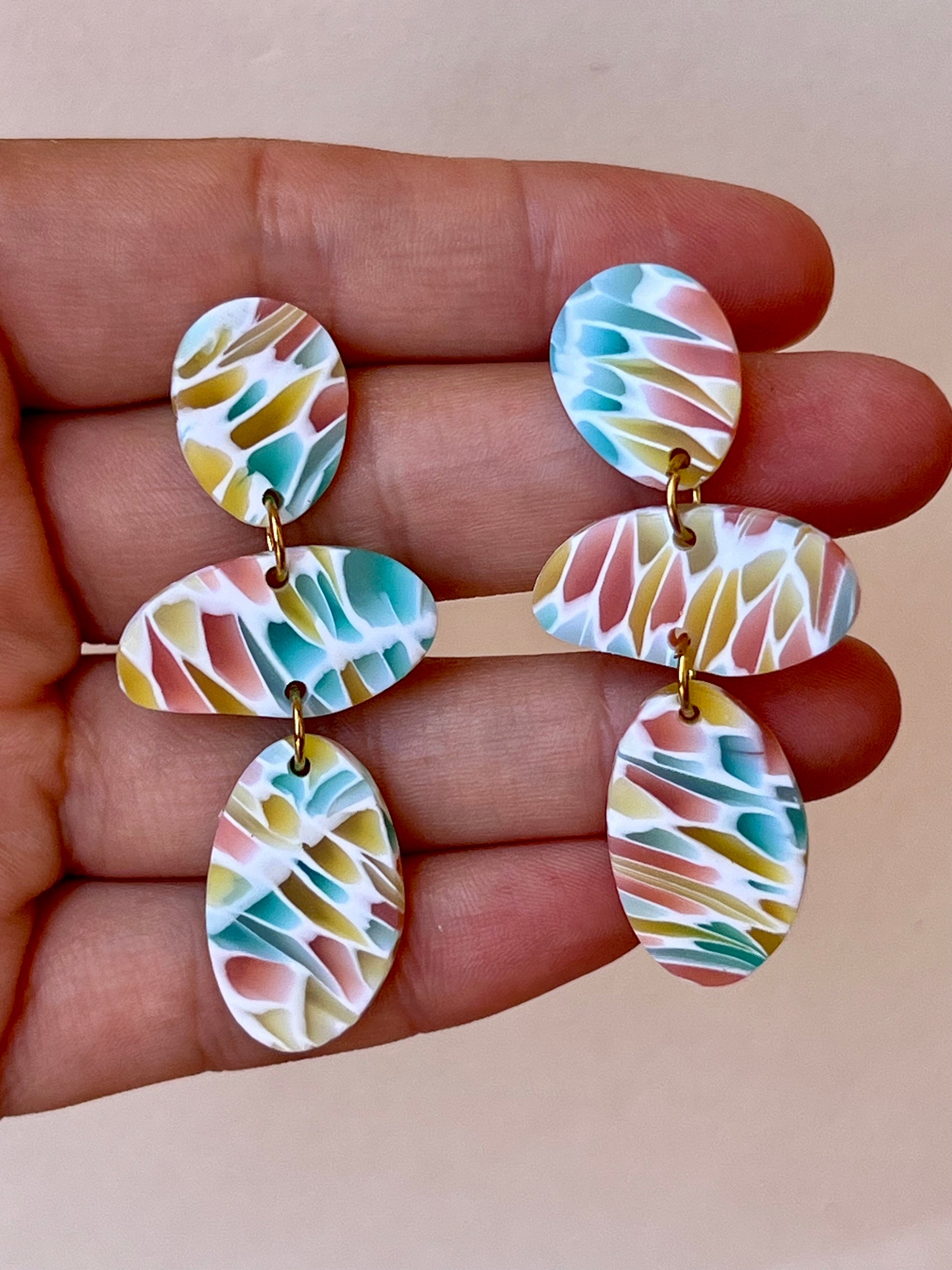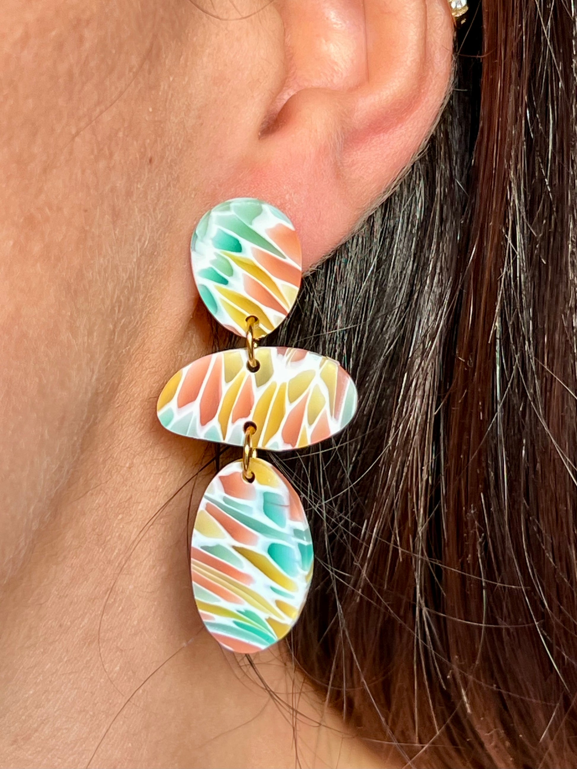 Pendientes hechos a mano de arcilla polimérica y cierres de acero inoxidable hipoalergénico.