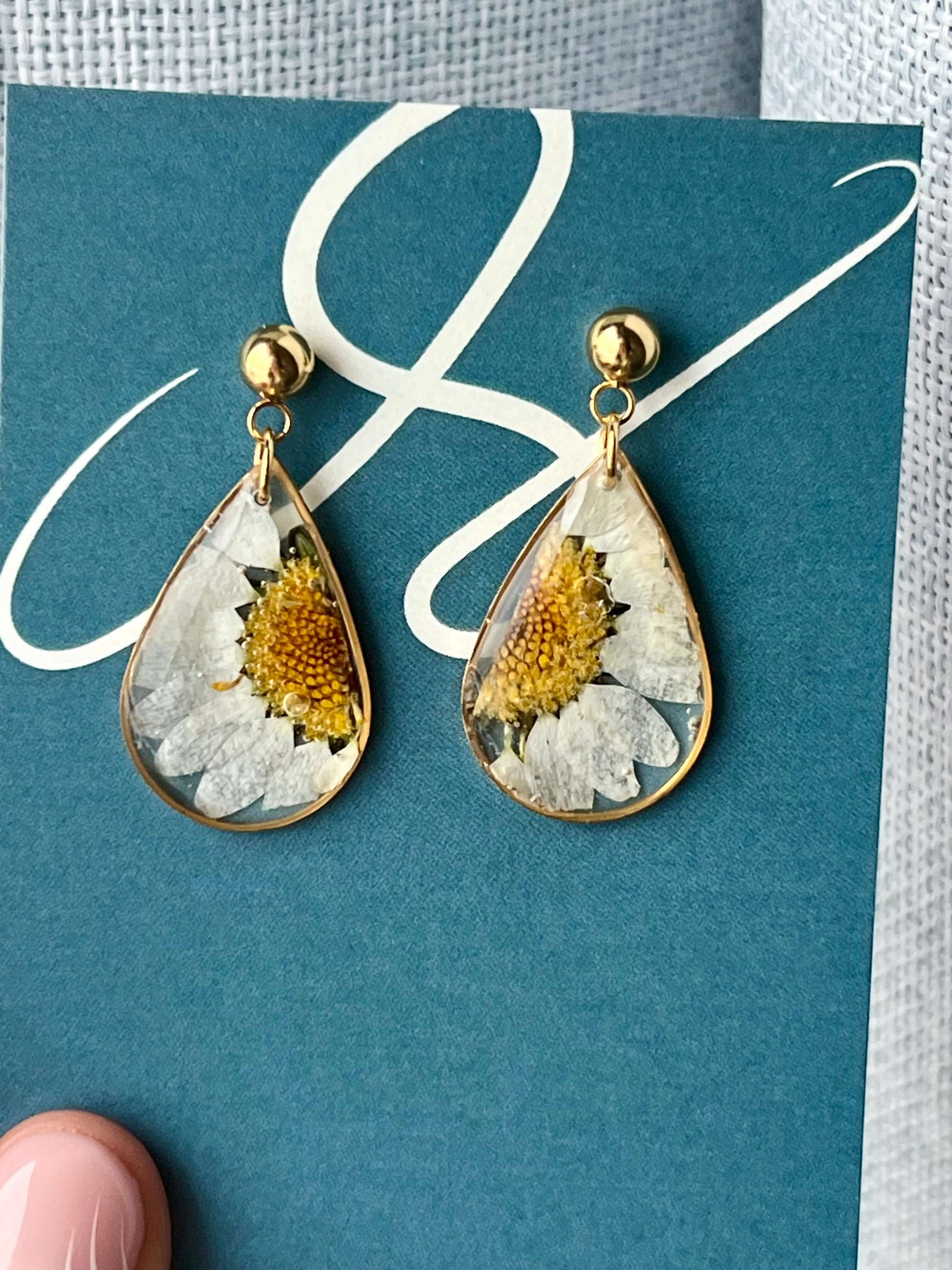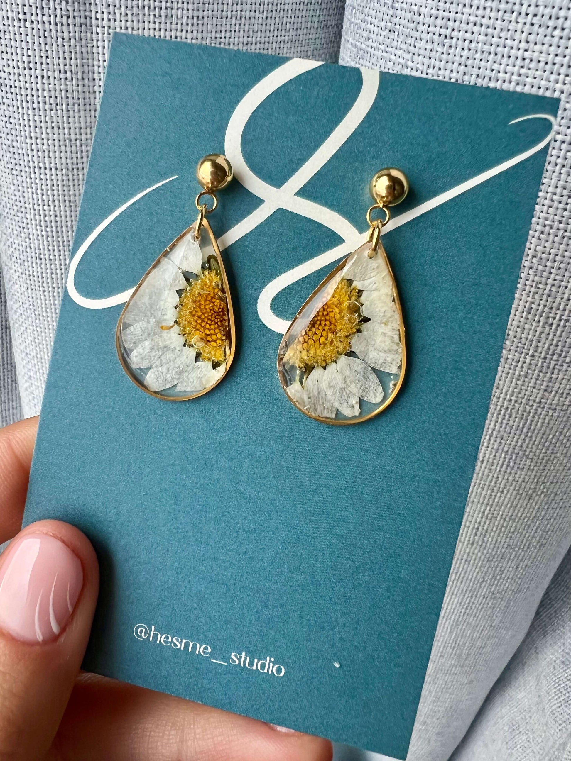 Pendientes hechos a mano con resina UV, flores naturales y acero inoxidable hipoalergénico.