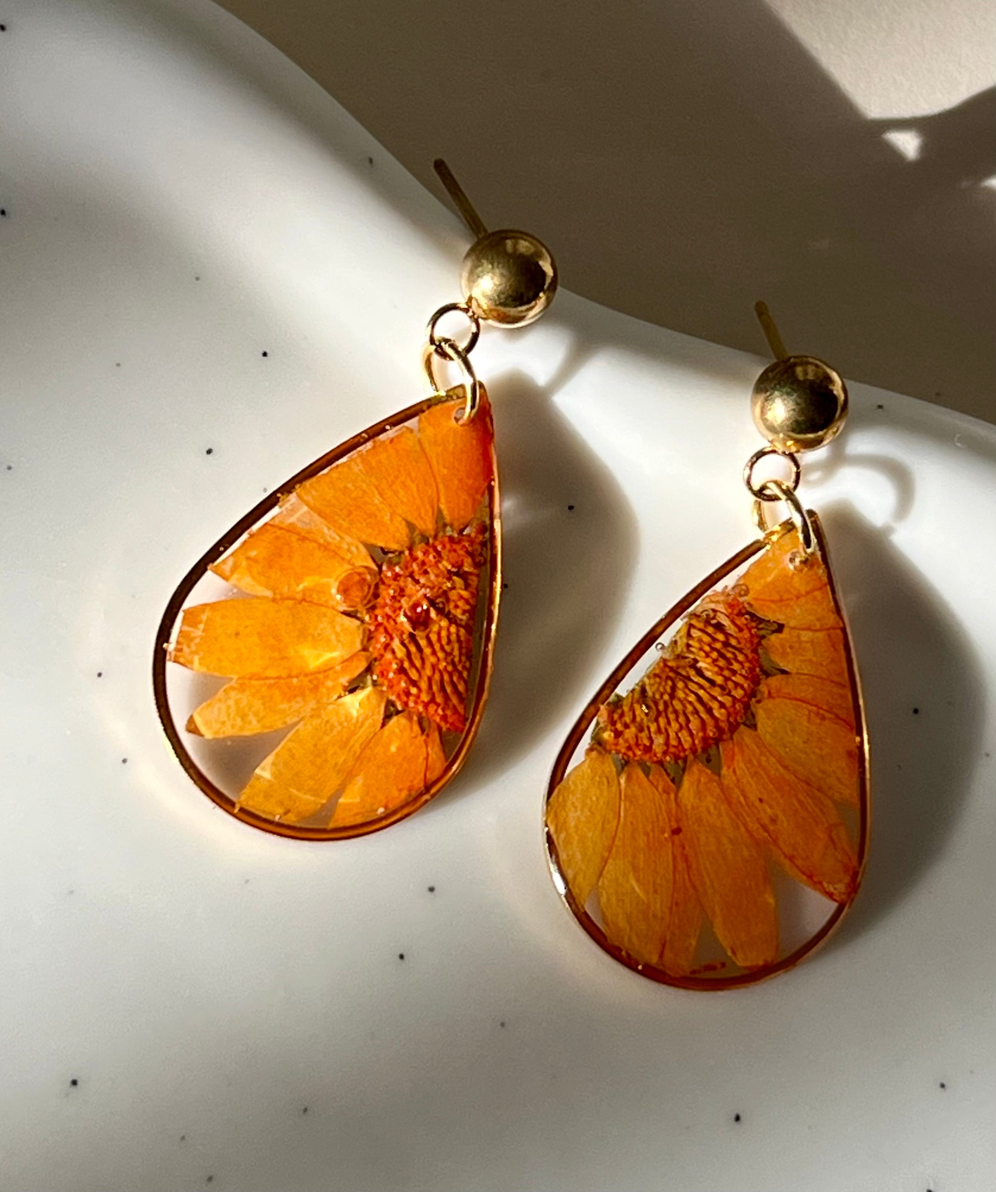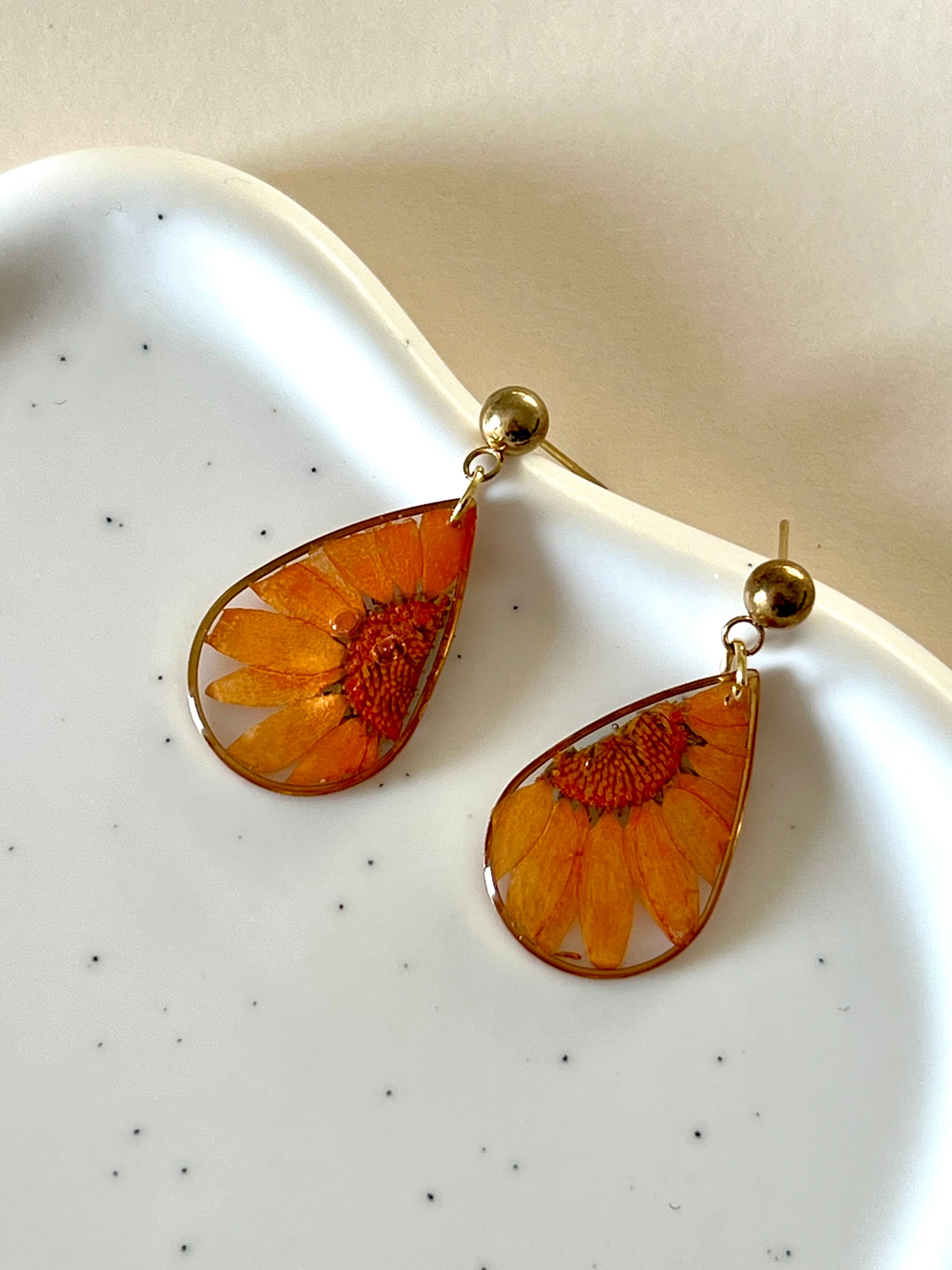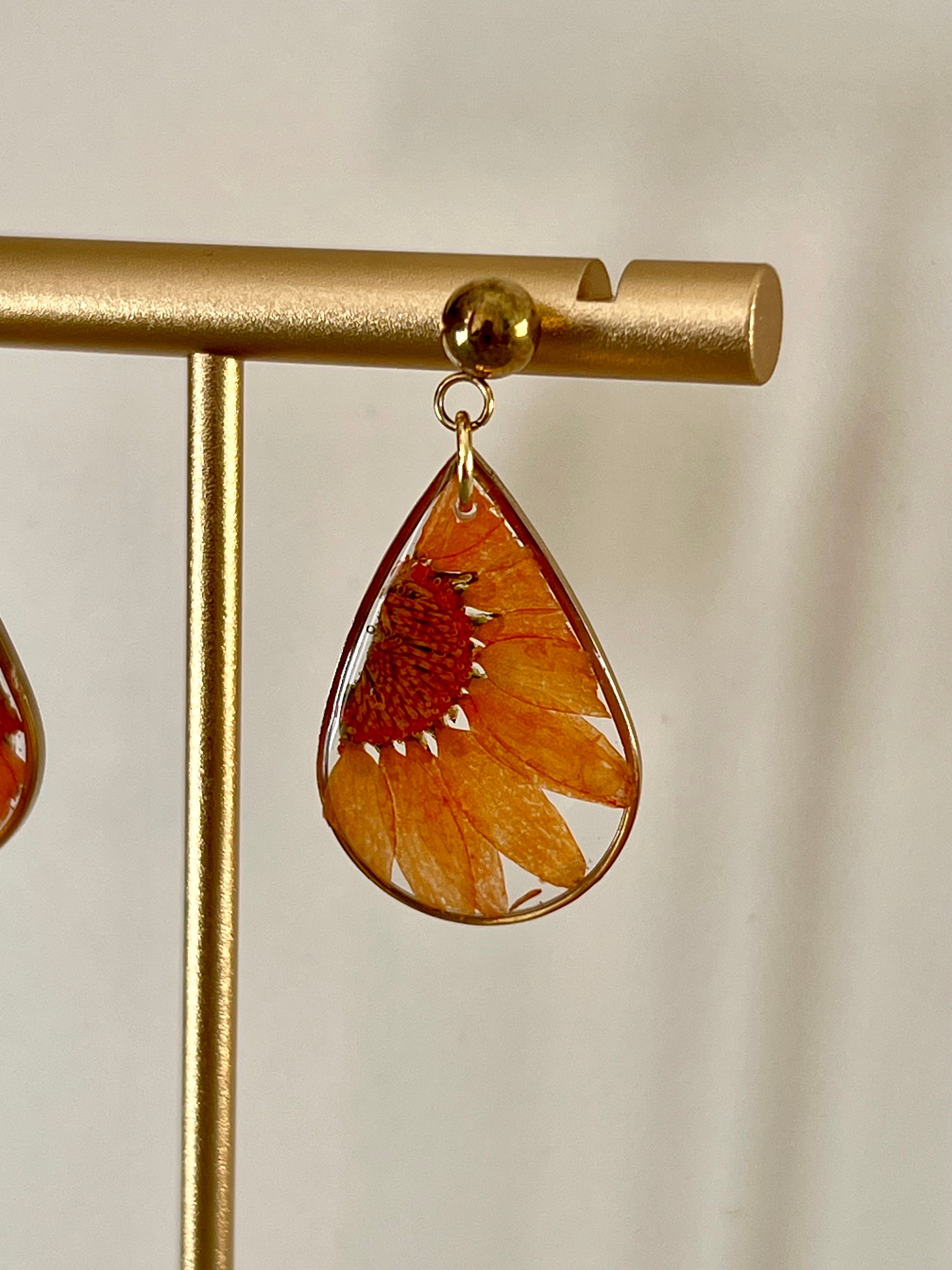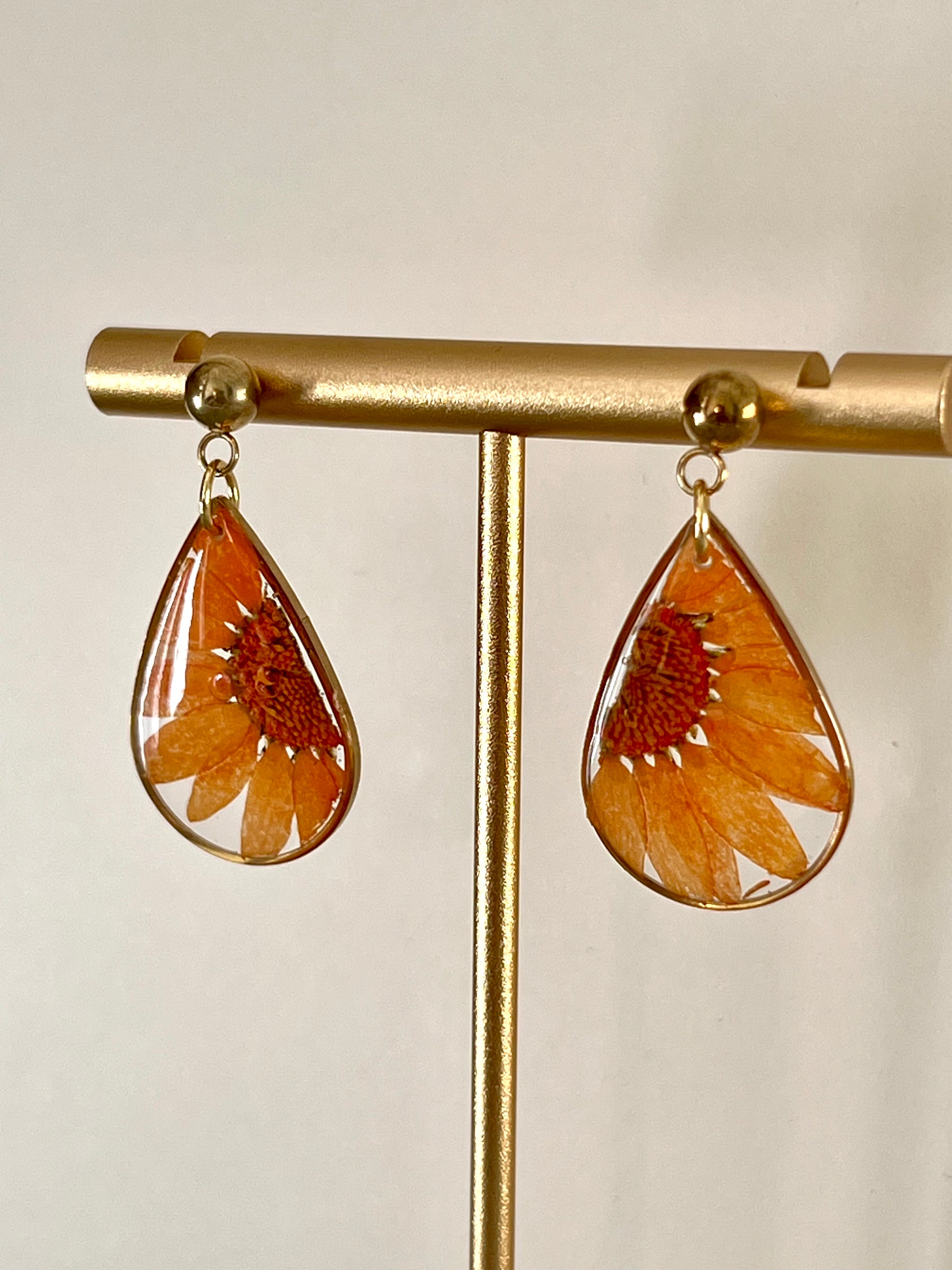 Pendientes hechos a mano con resina UV, flores naturales y acero inoxidable hipoalergénico.