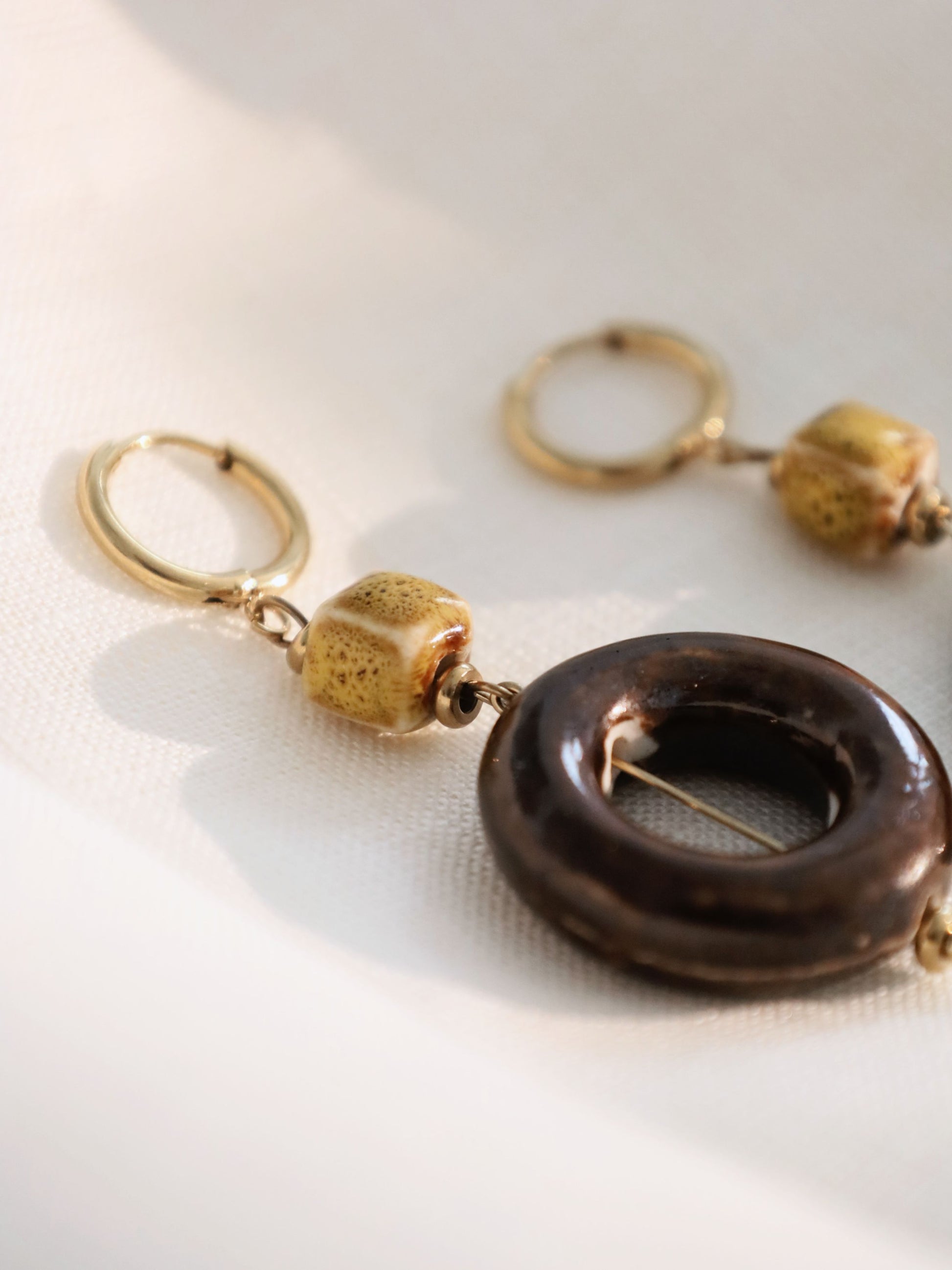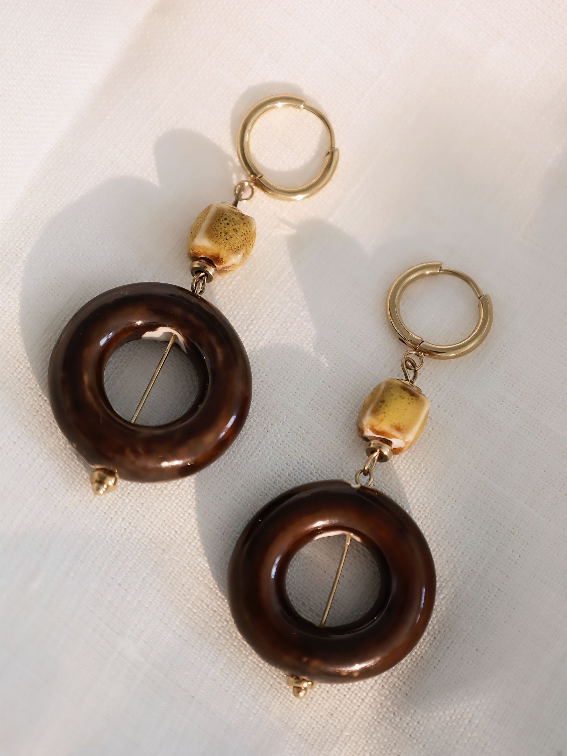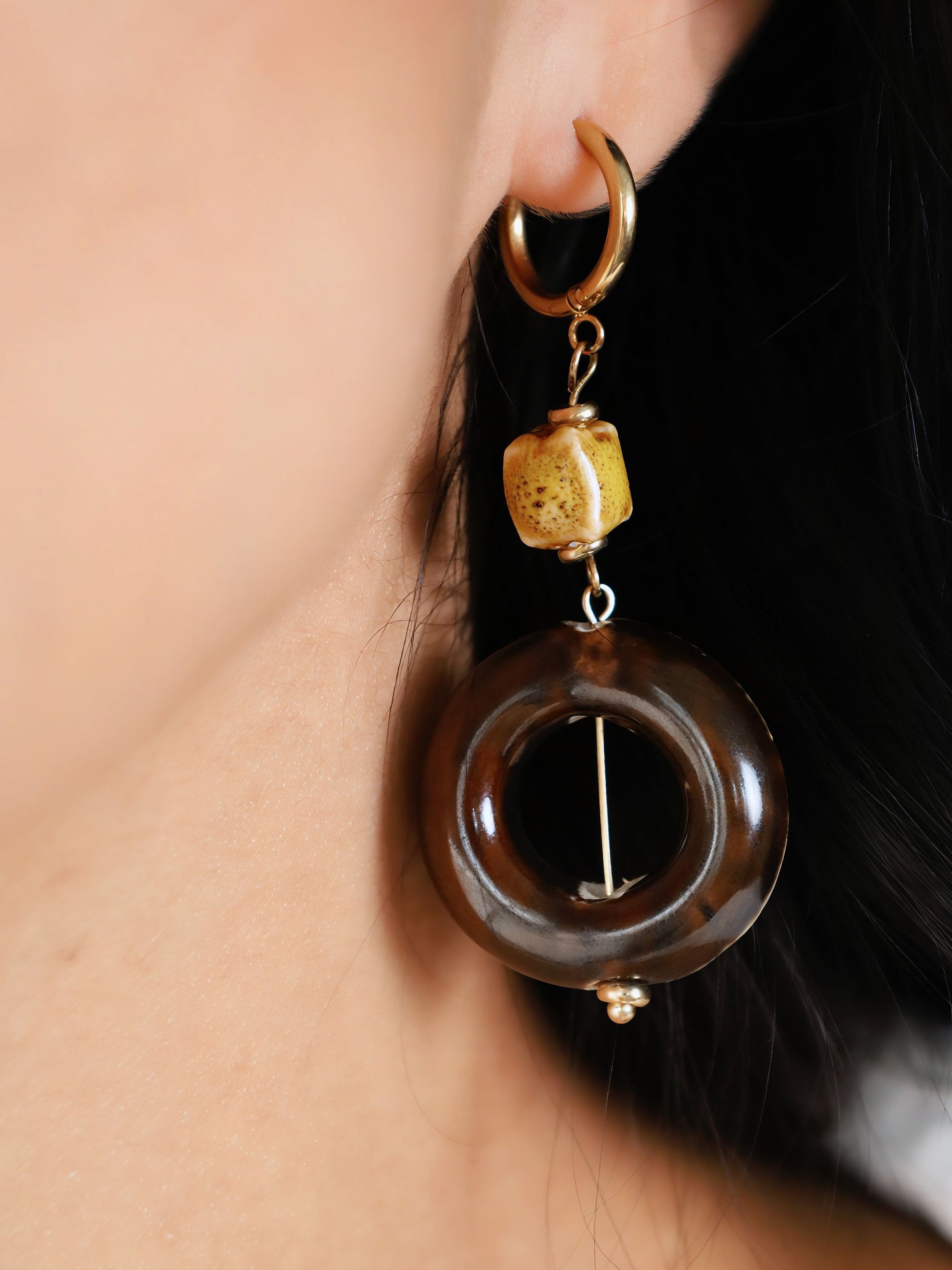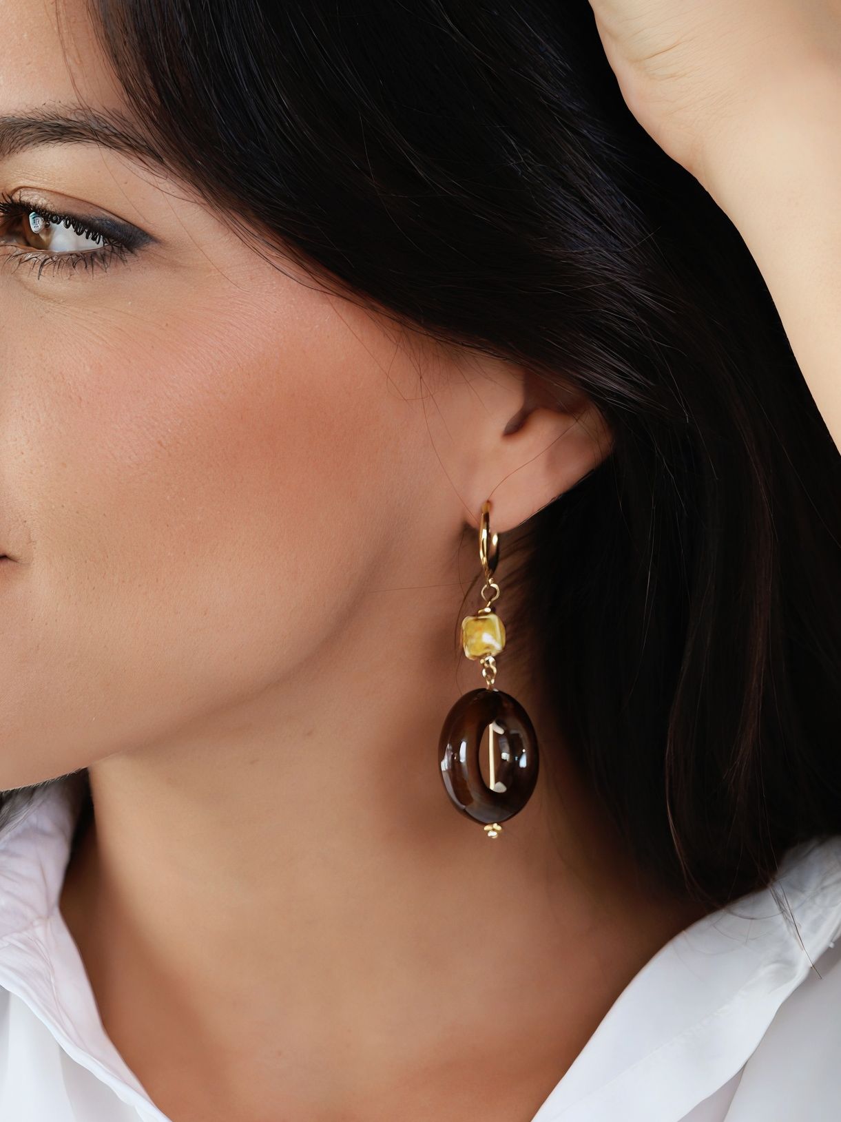 Pendientes con dos piedras y cierre de aro, fabricados en acero inoxidable hipoalergénico, resistente y duradero.