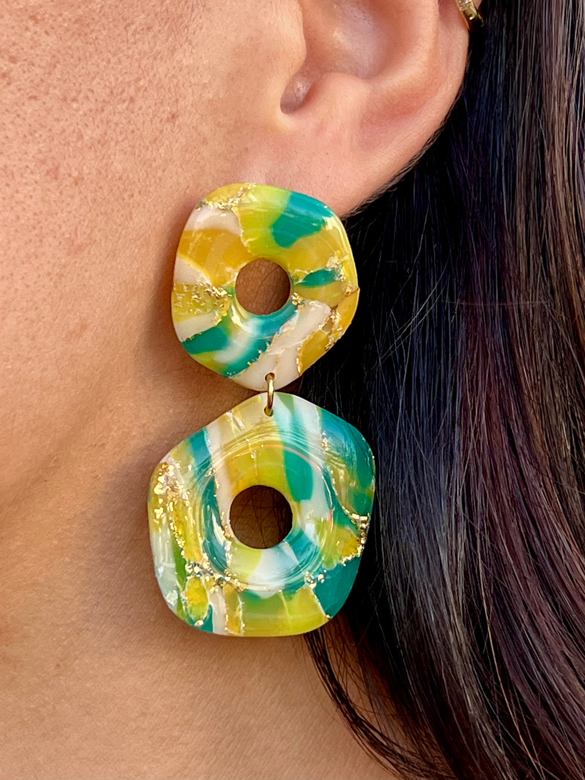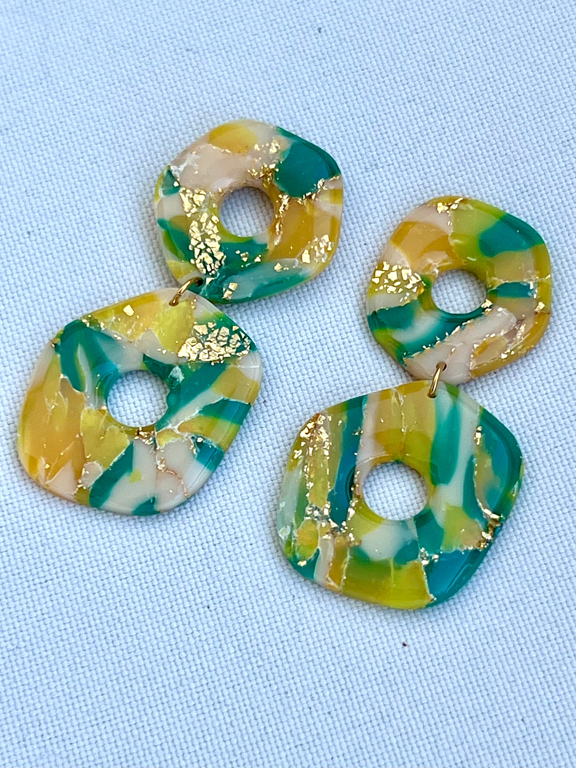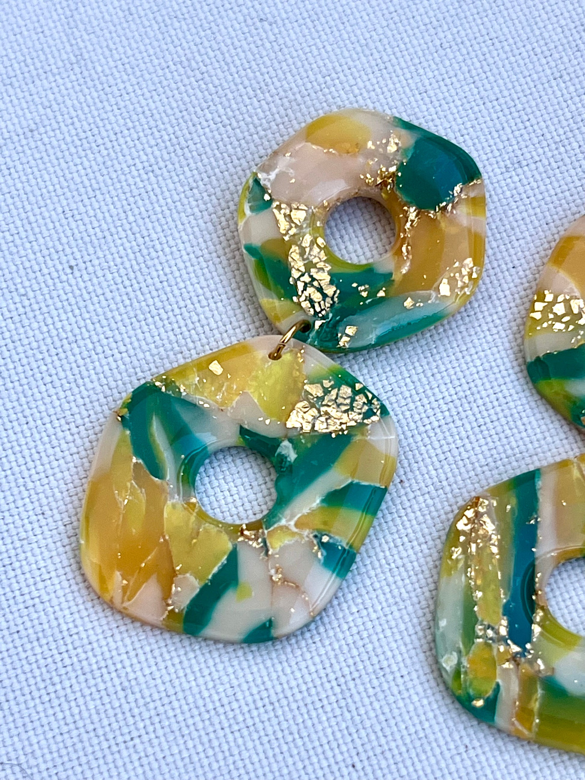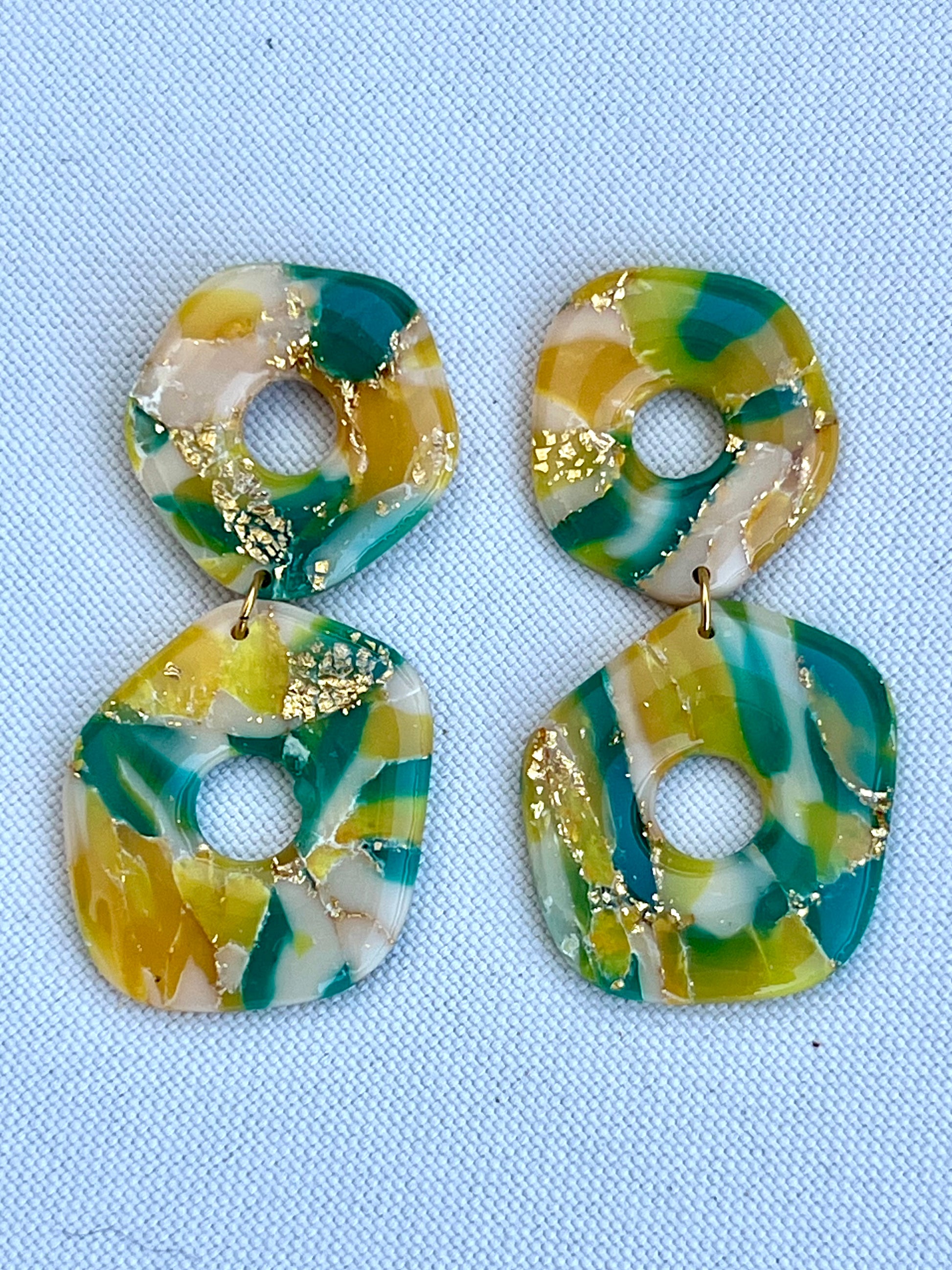 Pendientes hechos a mano de arcilla polimérica, resina UV y cierres de acero inoxidable hipoalergénico.