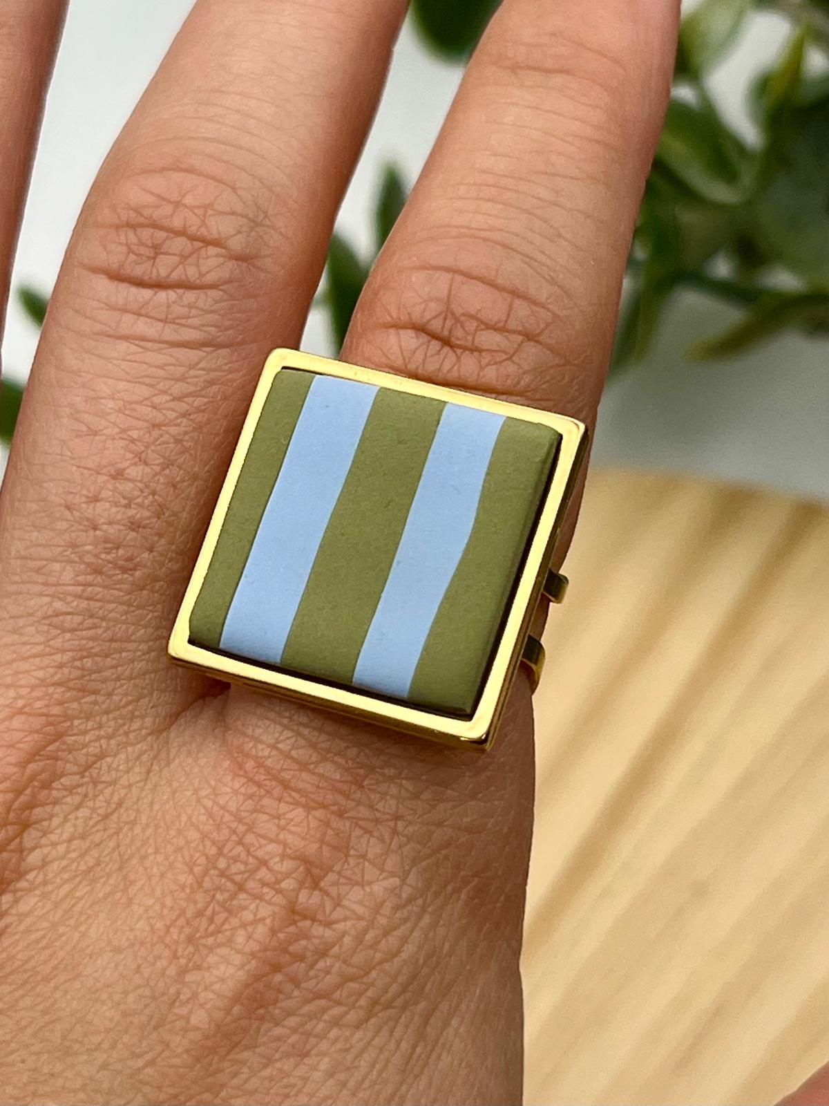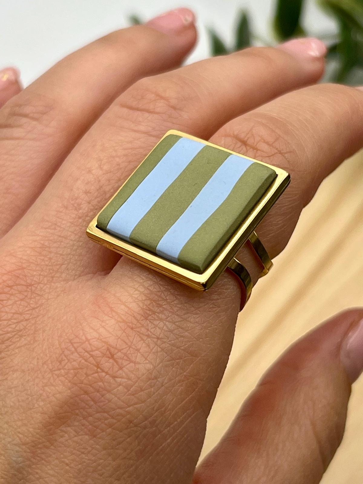 Anillo ajustable hecho a mano con arcilla polimérica y acero inoxidable.