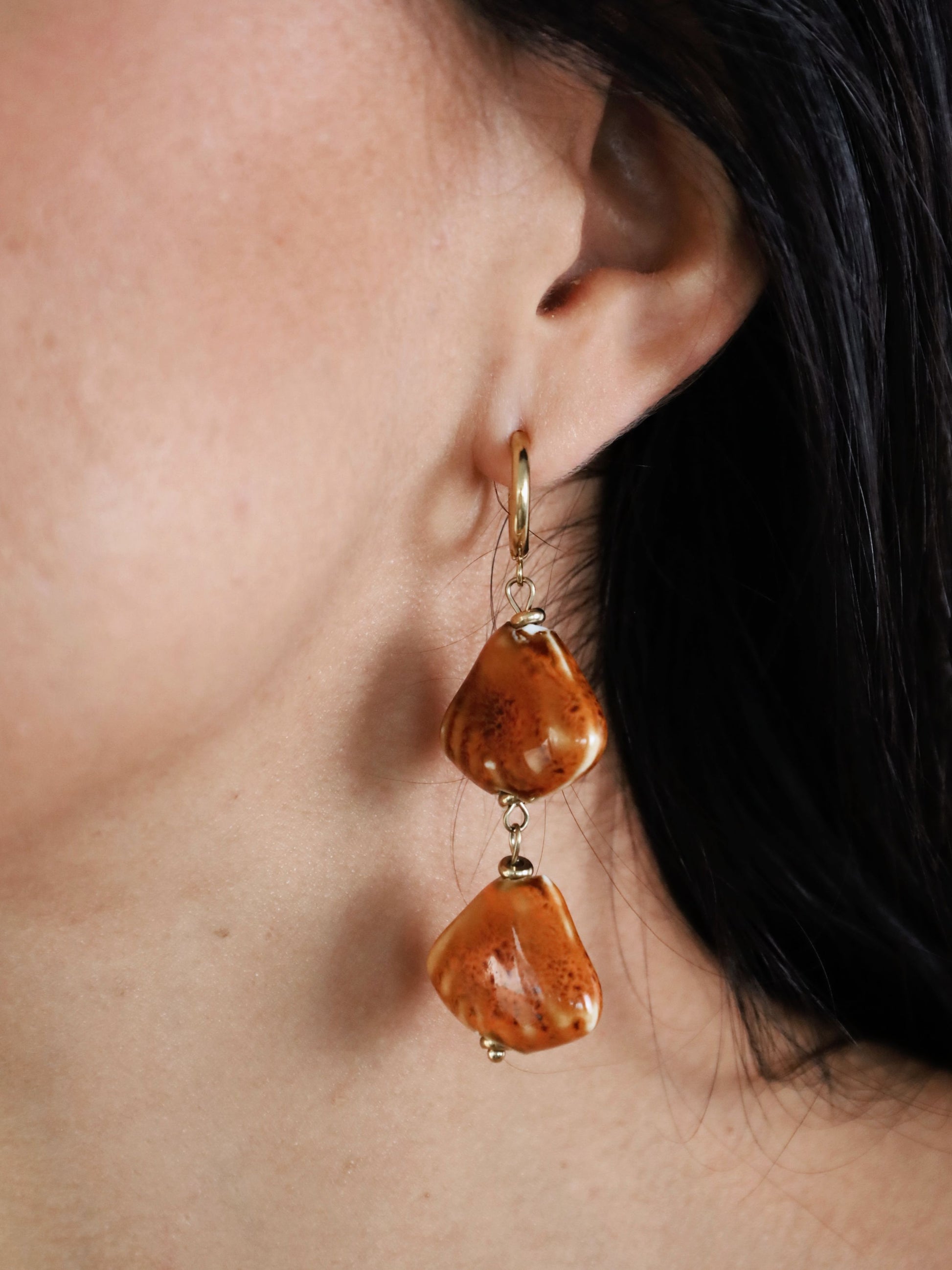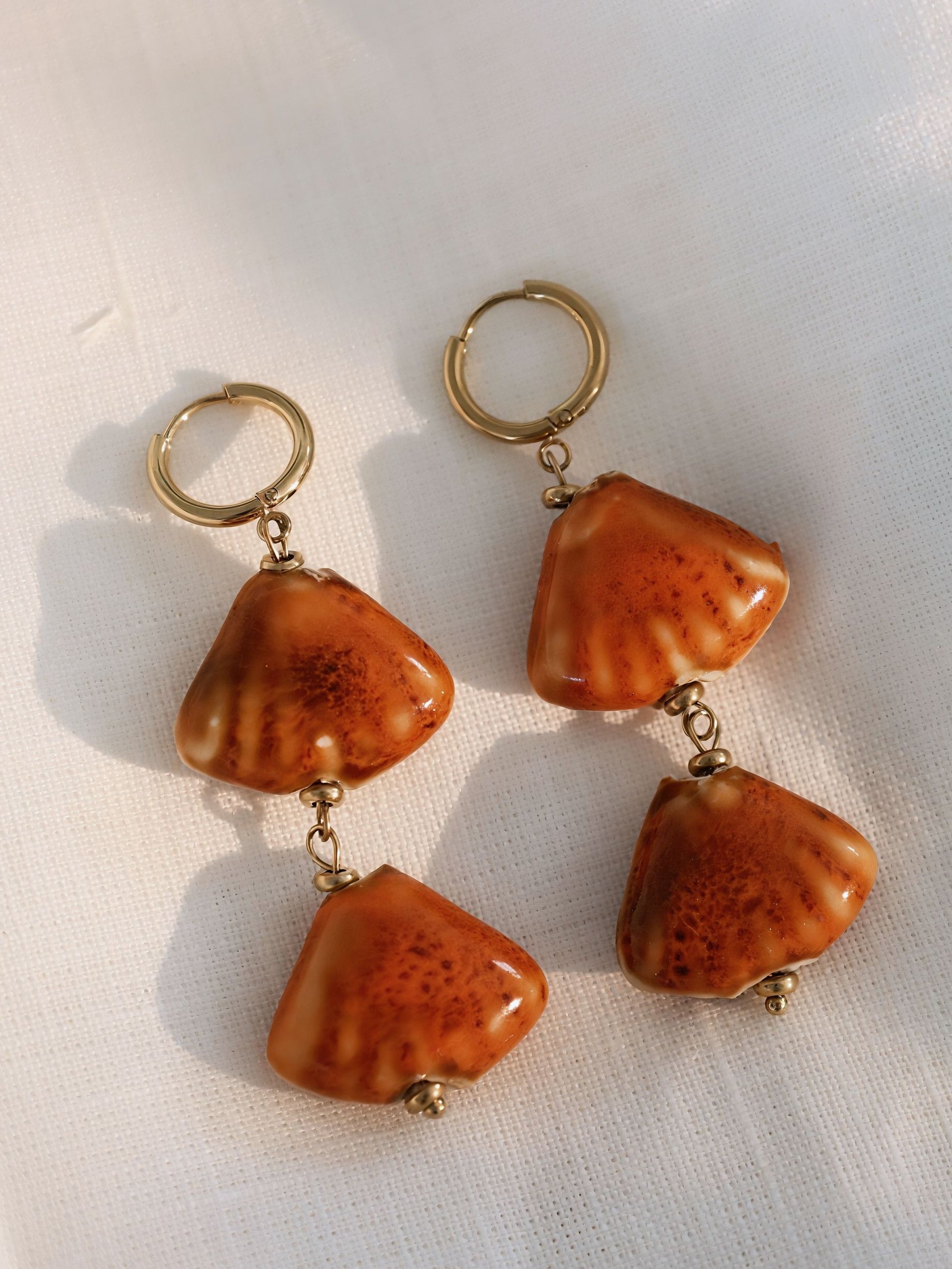 Pendientes con dos piedras en forma de concha y cierre de aro, fabricados en acero inoxidable hipoalergénico, resistente y duradero.